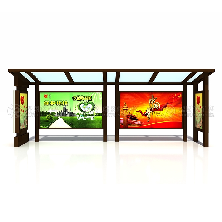 一般采用不銹鋼為框架,鋼化玻璃或者耐力板為面板,鋁合金為頂棚,面板可以打開更換宣傳畫面。